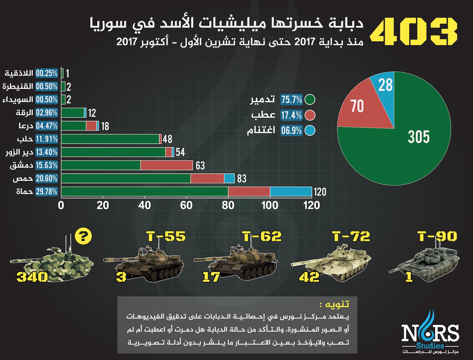 Yerel haber aktarımı yapan "Nors For Studies" ajansı tarafından servis edilen rakamlara göre, 2017 yılı başlangıcından Ekim ayı sonuna kadar yaklaşık on aylık süre içinde Esed rejimine bağlı güçlere ait toplam 403 tank tahrip edildi.
