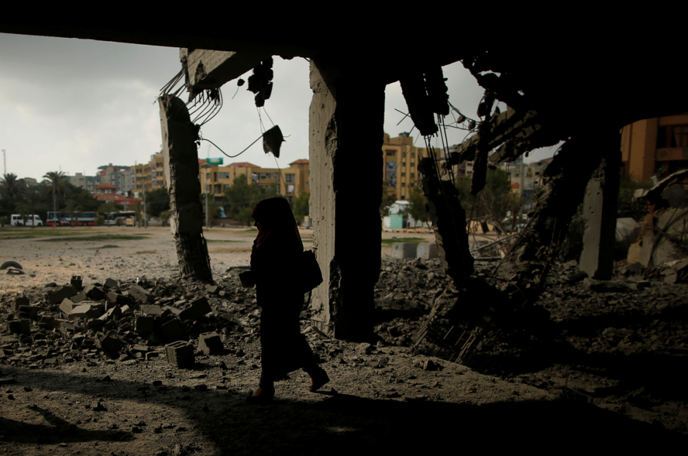 Filistinli bir kadın, bombardımanda yıkılmış bir binanın enkazının arasından geçiyor.