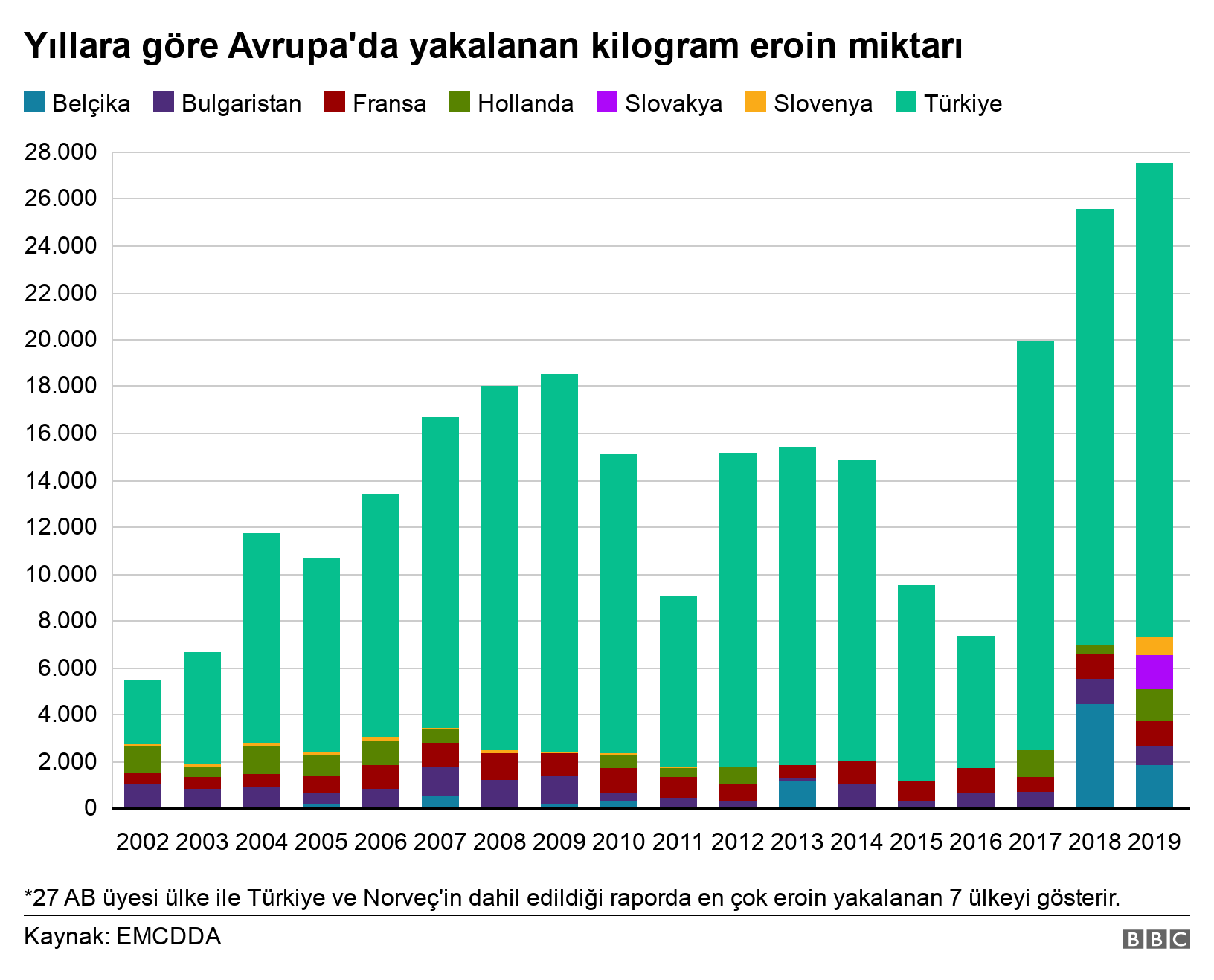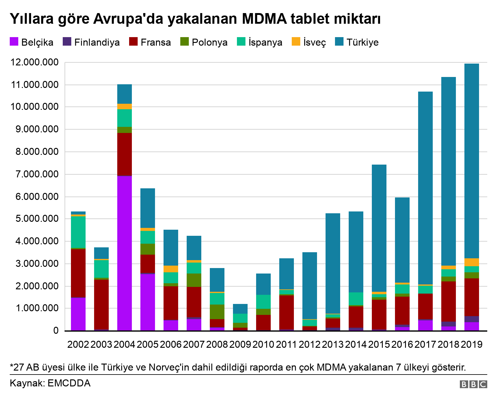 Avrupa Birliği'ne bağlı Avrupa Uyuşturucu ve Uyuşturucu Bağımlılığı İzleme Merkezi'nin (EMCDDA) yayımladığı 2021 raporuna göre, Türkiye'de 2019 yılında ele geçirilen MDMA ve eroin miktarı diğer tüm birlik üyesi ülkeleri geçti.