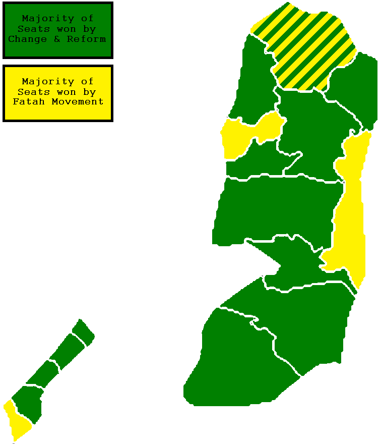 2006 seçimleri sonrası tarafların seçimi öne bitirdikleri seçim bölgeleri. Yeşil: Hamas, Sarı: El Fetih