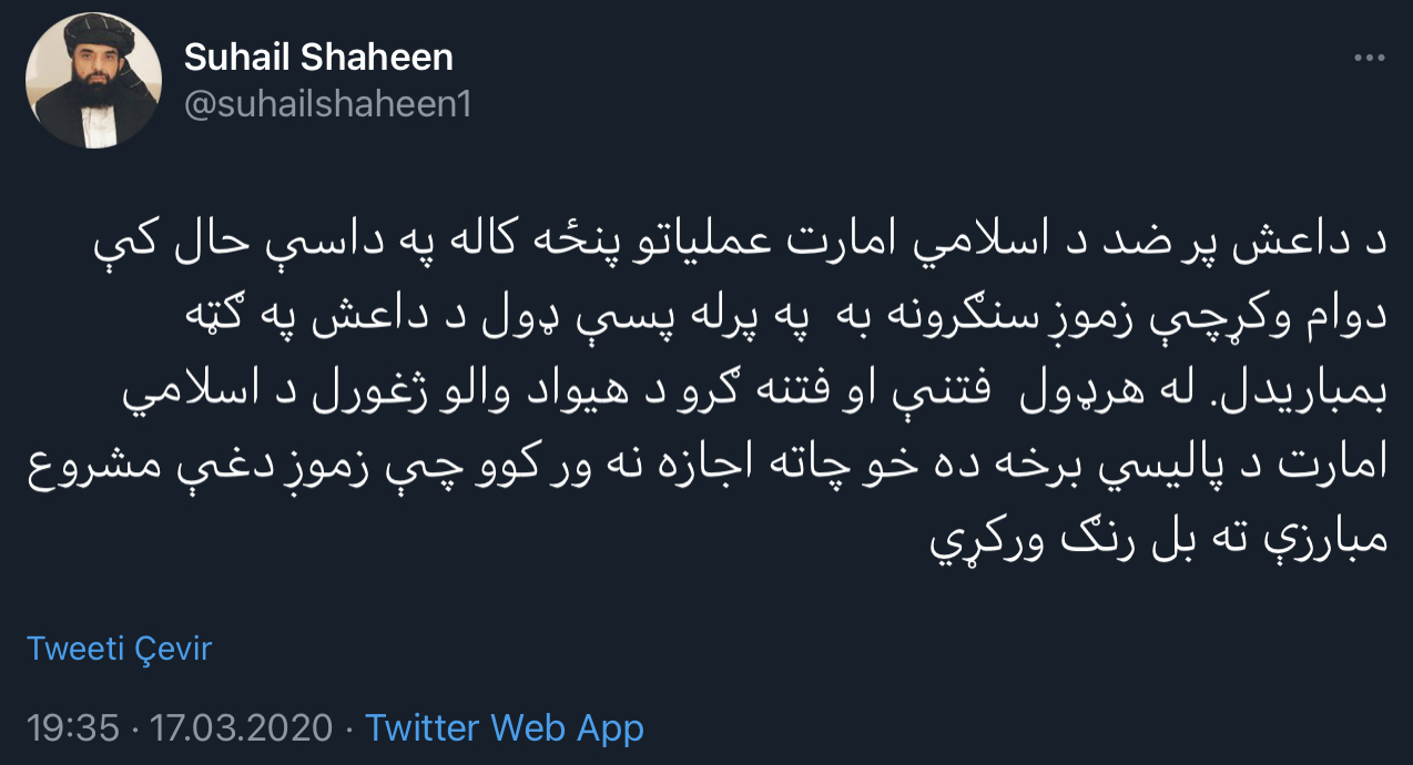 Geçtiğimiz Mart ayında da aynı konu gündeme gelmiş, Taliban’ın o dönemdeki Siyasi Ofis Sözcüsü Suheyl Şahin, konuya dair yaptığı açıklamada, “5 yıldır DAEŞ’e karşı savaşıyoruz. Her saldırımızda mevzilerimiz DAEŞ lehine bombalandı. Kimsenin meşru mücadelemizi lekelemesine izin vermeyiz.” ifadelerini kullanmıştı.