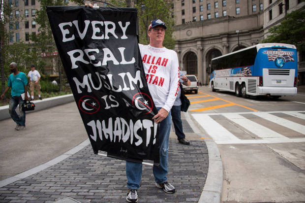 Bir ACT for America üyesi "Bütün gerçek Müslümanlar bir cihatçıdır" pankartı taşıyor