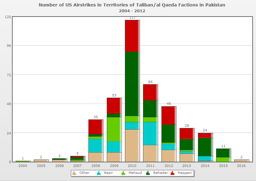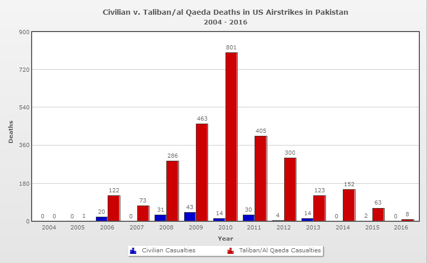 2006 yılından günümüze kadar gerçekleşen saldırılarda 2,797 Taliban, El-Kaide ve bağlantılı aşırı yanlısı grupların lideri ile 158 sivilin öldürülmüş olduğu varsayılmaktadır. Bu tablo 2004 ile 2005 yıllarını içermemektedir.