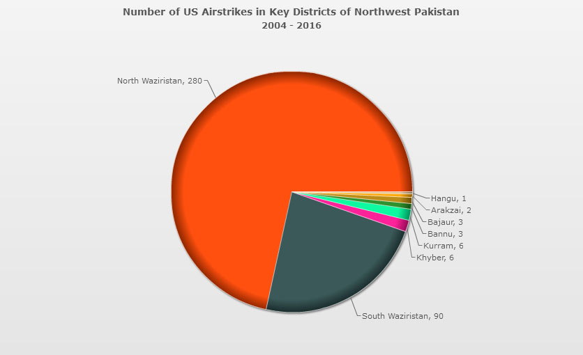 Geçtiğimiz 6 yılda saldırılar iki bölgede yoğunlaşmıştır: Kuzey ve Güney Veziristan bölgeleri. Geçtiğimiz iki yılda saldırıların gerçekleştiği bölgelerde önemli bir değişiklik görülmektedir. 2009 yılında saldırıların %51’i Güney Veziristan bölgesinde ve %44’ü Kuzey Veziristan bölgesinde gerçekleşmiştir. 2010 yılında ise dağılım %89 Kuzey Veziristan, %6 Güney Veziristan olarak değişmiştir.