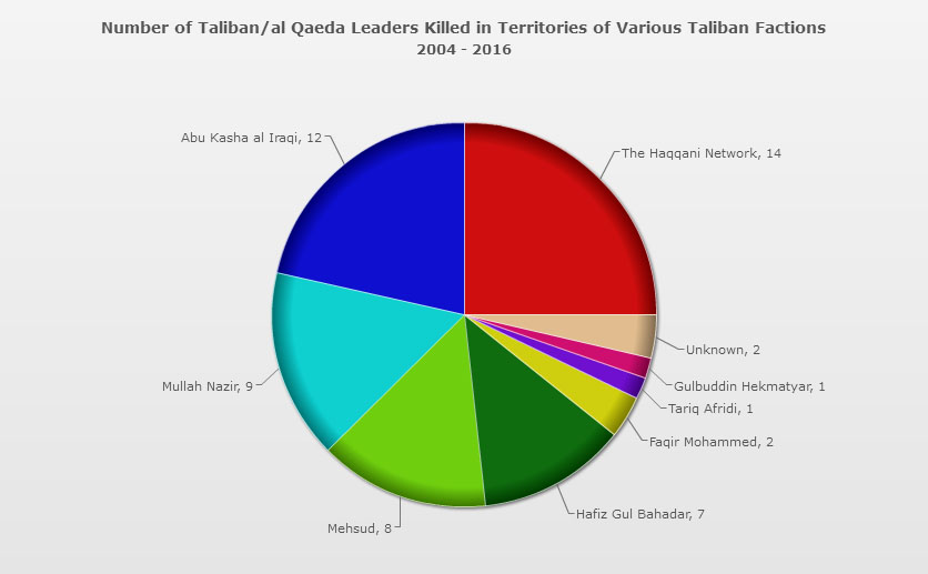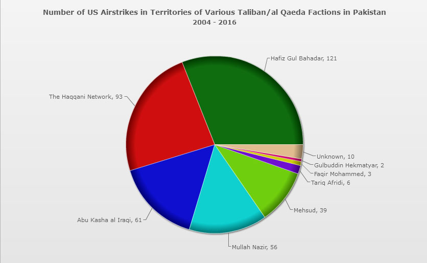 Molla Nezir ve Veliur Rahman aşiretleri Güney Veziristan’da yaşamaktadır. Hakkani, Hafız Gül Bahadır ve Ebu Keşha El Iraki Kuzey Veziristan’da yer almaktadır. (Hakimullah Mesud Arakzay’da, Fakir Muhammed Bacur’da ) Gülbeddin Hikmetyar tarafından idare edilen Güney Veziristan’daki 2 üs de vurulan yerler arasındadır. Ayrıca 10 saldrının hangi kabile bölgesinde gerçekleştiği verilen raporlarda yer almamıştır.