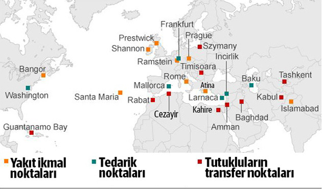 .Tutsakların duraklamasına izin verildiği iddia edilen ülkeler arasında, Türkiye, Yunanistan, Belçika, İngiltere, İrlanda, İspanya ve Portekiz yer aldı. CIA esirlerinin nakillerinde Türkiye’deki tedarik noktası ise 2006 yılında BBC’nin yayınladığı başka bir haritada ABD’nin İncirlik üssü olarak gösterilmişti.