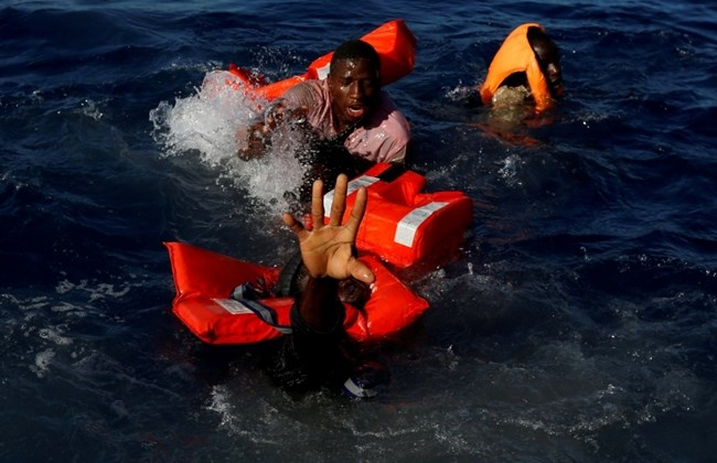 Göçmenler, 14 Nisan 2017'de Libya'daki Zawiya sahilinden yaklaşık 15 deniz mili uzakta bulunan orta Akdeniz'deki Malta merkezli Migrant Offshore Aid Station (MOAS) gemisinin kurtarma operasyonu sırasında kauçuk botlarından düştükten sonra ayakta kalmaya çalışıyor.