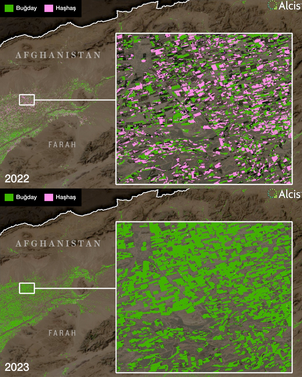 The Telegraph'tan Samuel Lovett'in haberine göre, coğrafi bilgi hizmeti sağlayan Alcis şirketinin uydu görüntülerine dayandırdığı analize göre, Afganistan'da 2022'de 210.000 hektardan fazla olan haşhaş ekimi, 2023 yılında ülke çapında 30.000 hektarın altında kalmış durumda.