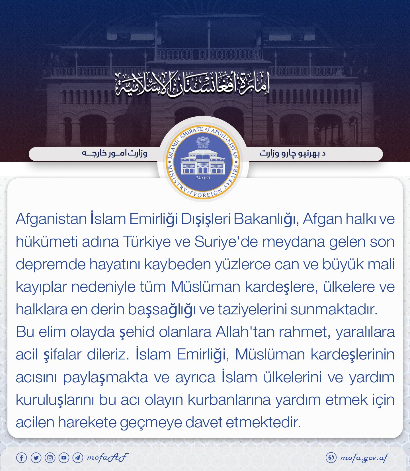 "Afganistan İslam Emirliği Dışişleri Bakanlığı, tüm Afgan halkı ve hükümeti adına, Türkiye ve Suriye'deki son depremin yol açtığı yüzlerce can kaybı ve büyük iktisadi kayıplar sebebiyle Müslüman kardeşlerine, ülkelere ve insanlara en derin taziyelerini ve anlayışlarını sunar.