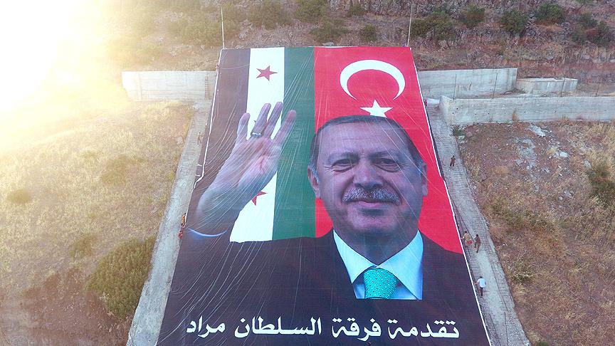 ÖSO, Afrin'in Darmık Dağı'na, Cumhurbaşkanı Erdoğan fotoğrafıyla Türk ve Suriye devrimi bayraklarının yer aldığı dev bir poster astı.