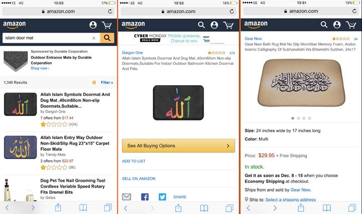 Allah Lafzı'nın (Arapça söz anlamında gelen bu kelime, yazımı ifade öden özel bir söylemdir) işlenmesinden dolayı ürünlerin İslam dinini aşağıladığını belirten internet kullanıcıları siteyi şikayet yağmuruna tuttular. Aslında geçtiğimiz haziran ayından bu yana satışta olan paspas ve minder, İngiltere'nin Birmingham şehrindeki Müslüman meclis üyesi Mariam Khan’ın Twitter üzerinden paylaşmasıyla ön plana çıktı. Gelen şikayetler üzerine Khan’dan özür dileyen Amazon, ilgili mağazanın ürünlerini kaldırdı. Din gibi hassas bir konuda böylesi ürünlere izin veren Amazon'un daha duyarlı şekilde hareket etmesi talep edildi.