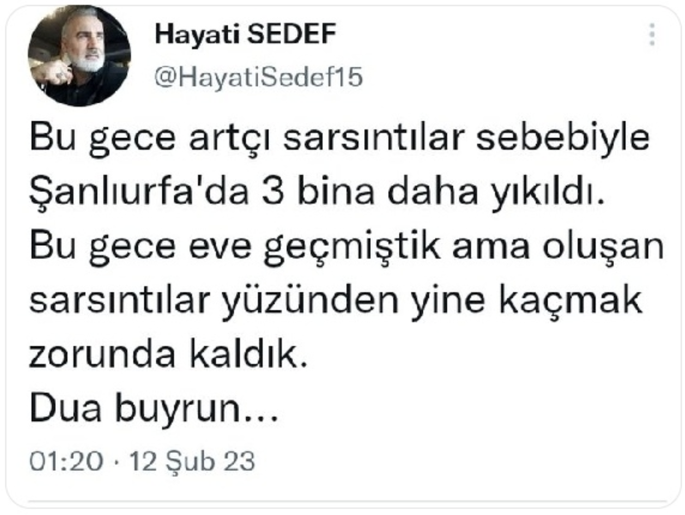 Hayati Sedef, Twitter'da yaptığı bir paylaşımda, "Bu gece artçı sarsıntılar sebebiyle Şanlıurfa'da 3 bina daha yıkıldı. Bu gece eve geçmiştik ama oluşan sarsıntılar yüzünden yine kaçmak zorunda kaldık. Dua buyrun..." ifadelerini kullanmıştı.