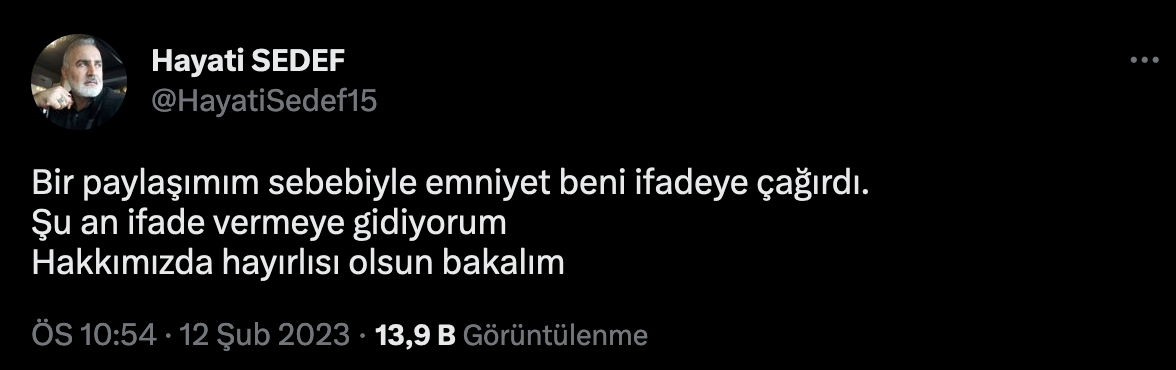 Twitter kullanıcısı Hayati Sedef'in, depremin ardından paylaştığı bir mesaj gerekçe gösterilerek tutuklanmıştı.