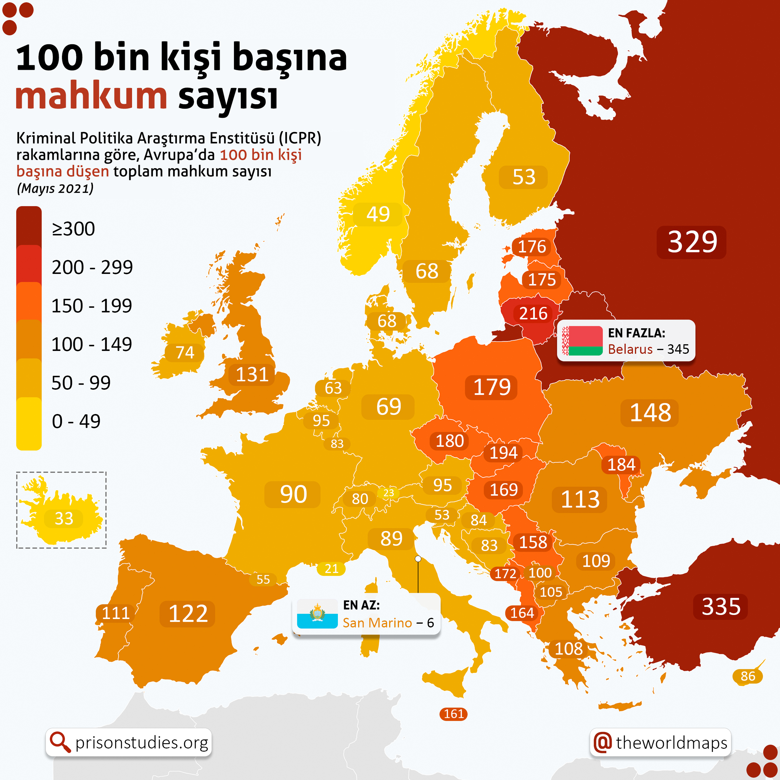 Kriminal Politika Araştırma Enstitüsü'nün (ICPR) rakamlarına göre, Avrupa’da 100 bin kişibaşına düşen toplam mahkum sayısı, Mayıs 2021 itibarıyla şu şekilde: