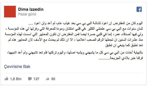 Suriye asıllı spiker Dima İzzeddin, sosyal medya hesabından yaptığı paylaşımda "Ekranları bırakma vakti geldi. BBC sekiz yılda bana çok şey öğretti. Buradaki arkadaşlarımı çok seviyorum. Onlardan ayrıldığım için üzgünüm. Kurumun belli standartları olmalı. Fakat bu olmadı. Ne yazık ki hiçbir şey olması gerektiği gibi değil" dedi.