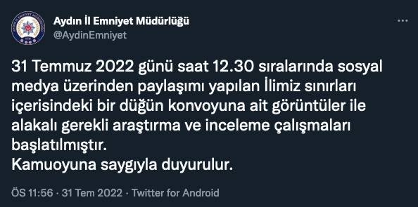 Bayrağın kullanıldığı düğün konvoyunun sosyal medya üzerinden hedef gösterilmesinin ardından konuyla ilgili açıklama yapan Aydın Emniyet Müdürlüğü, "31 Temmuz 2022 günü saat 12.30 sıralarında sosyal medya üzerinden paylaşımı yapılan ilimiz sınırları içerisindeki bir düğün konvoyuna ait görüntüler ile alakalı gerekli araştırma ve inceleme çalışmaları başlatılmıştır. Kamuoyuna saygıyla duyurulur" ifadelerini kullandı.