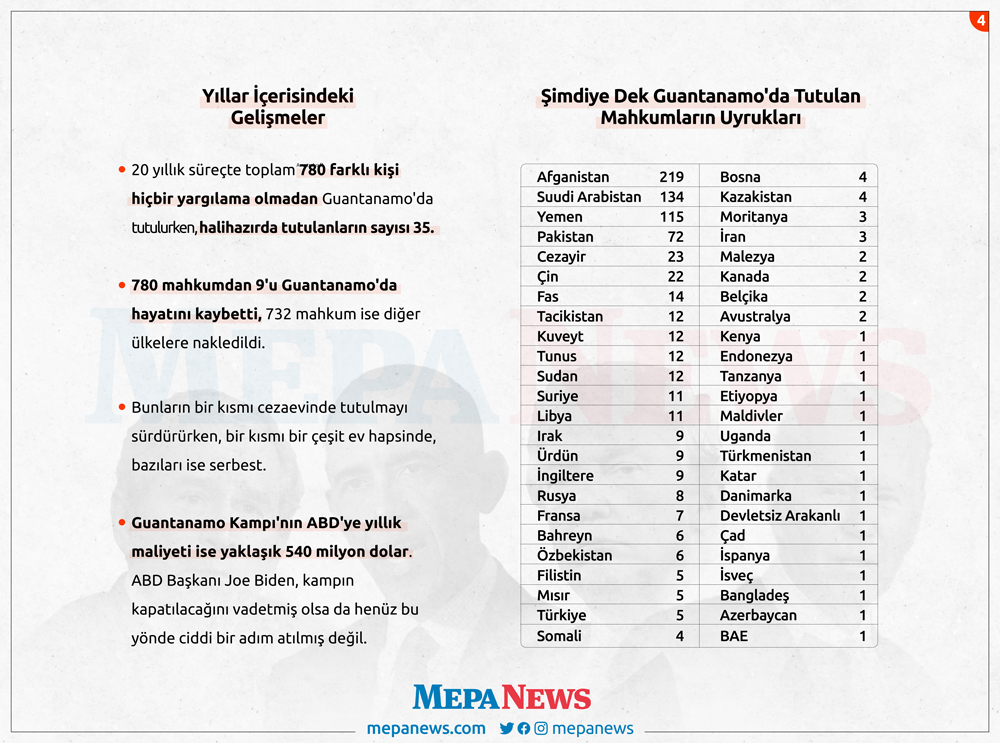 20 yıllık süreçte toplam 780 farklı kişi hiçbir yargılama olmadan Guantanamo'da tutulurken, halihazırda tutulanların sayısı 35.
