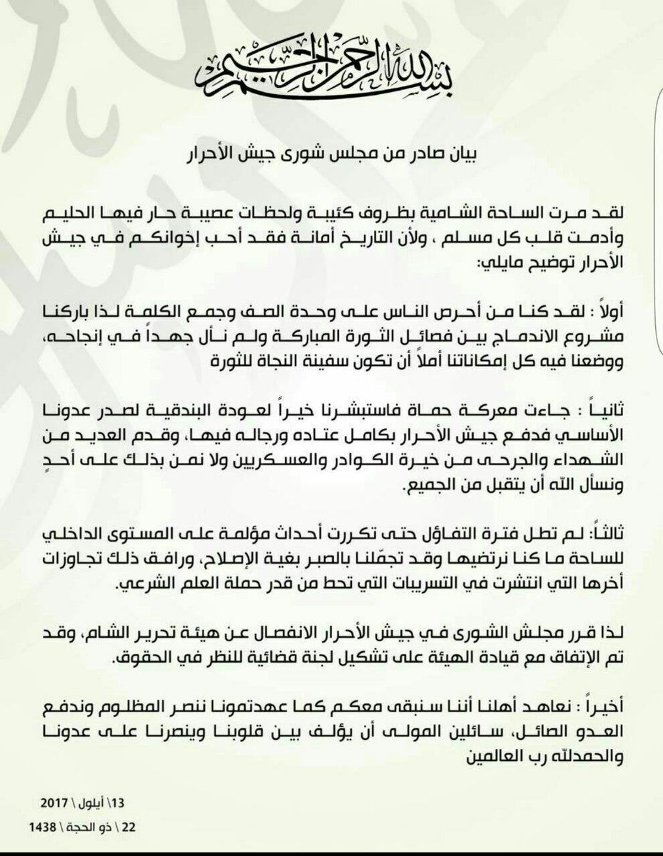 Ceyşul Ahrar tarafından yayınlanan açıklamada "Suriye sahasındaki son gelişmelere razı olmadığımız halde düzeleceği ve ıslah olacağı gayesiyle sabrettik. Ancak yaşanan son sızıntılarla (ses kayıtları kastediliyor) tüm bu gelişmelere din adamlarının küçümsenmesi gibi aşırılıklar eşlik etmiştir. Bu sebeple, Ceyşul Ahrar Şura Meclisi, Tahriru'ş Şam' grubundan ayrılmaya karar vermiştir." ifadeleri yer aldı.