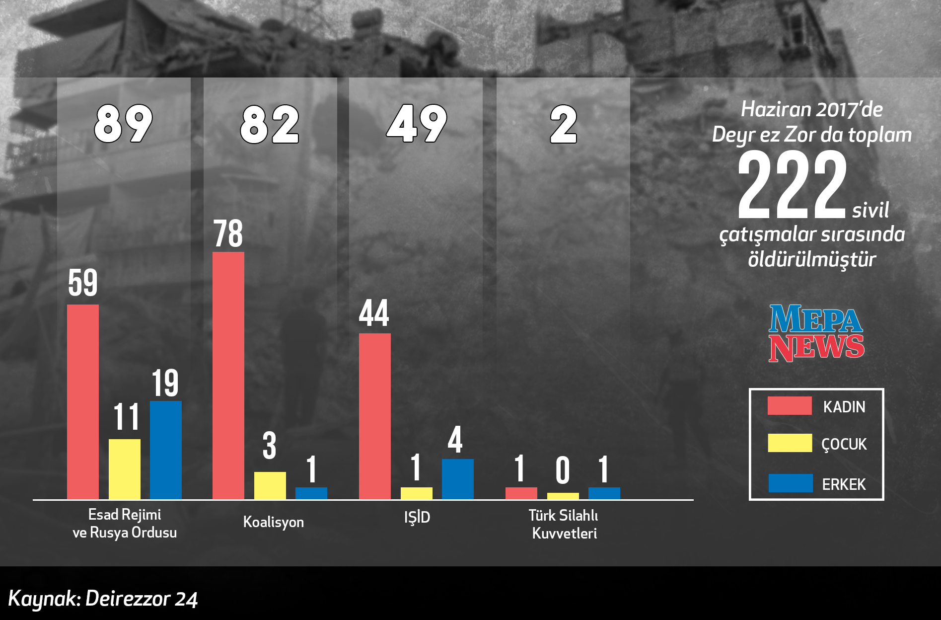 Yerel haber kaynağı olan Deirezzor24'ün aktardığına göre, Haziran ayında Suriye'nin doğusundaki Deyr ez Zor kentinde, düzenlenen hava saldırıları ve bölgede yaşanan çatışmalar yüzünden 222 sivil yaşamını yitirdi.