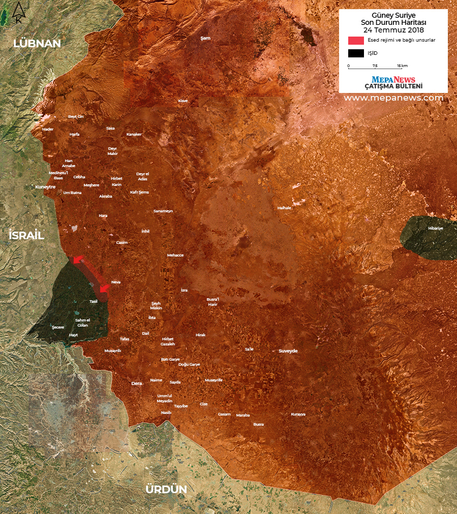 Dera'da muhaliflerin elinde kalan son toprakları ve kuzeydeki Kuneytra bölgesini de anlaşma yoluyla ele geçiren Rusya destekli rejim, yönünü IŞİD'e döndü. IŞİD'in güneyde varlık gösterdiği bölgelere saldırılar düzenlemeye başlaran Rusya ve İran destekli rejim koalisyonu henüz bölgede bir ilerleme sağlayabilmiş değil.