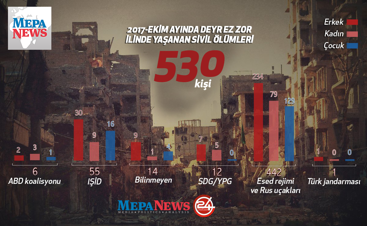 Servis edilen rakamlara göre Ekim ayında Deyr ez Zor kenti ve çevresine düzenlenen saldırılarda ölen en az 530 sivilin 150'si çocuk, 97'si kadın, 283'ü ise erkek.