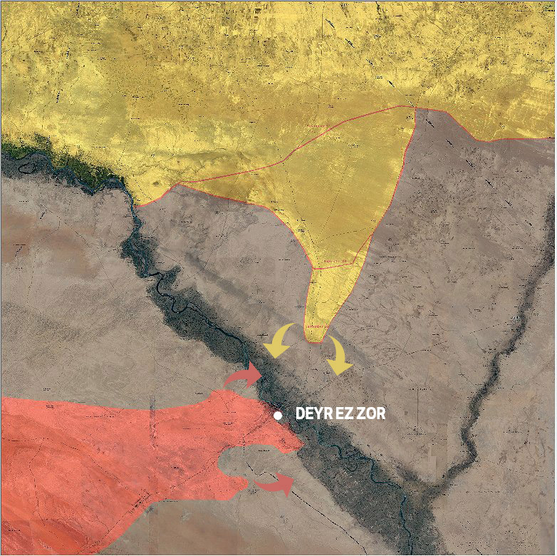 Suriye'nin doğusunda, bir kısmı IŞİD kontrolünde olan Deyr ez Zor kentine yönelik kuşatma Rusya'nın hava desteğiyle rejim güçleri ve yabancı Şii milislerce geçtiğimiz hafta 5 Eylül'de kırılmış, kent merkezinde yaşanan çatışmaların ardından rejime bağlı güçler Deyr ez Zor hava üssüne kadar ulaşmıştı.