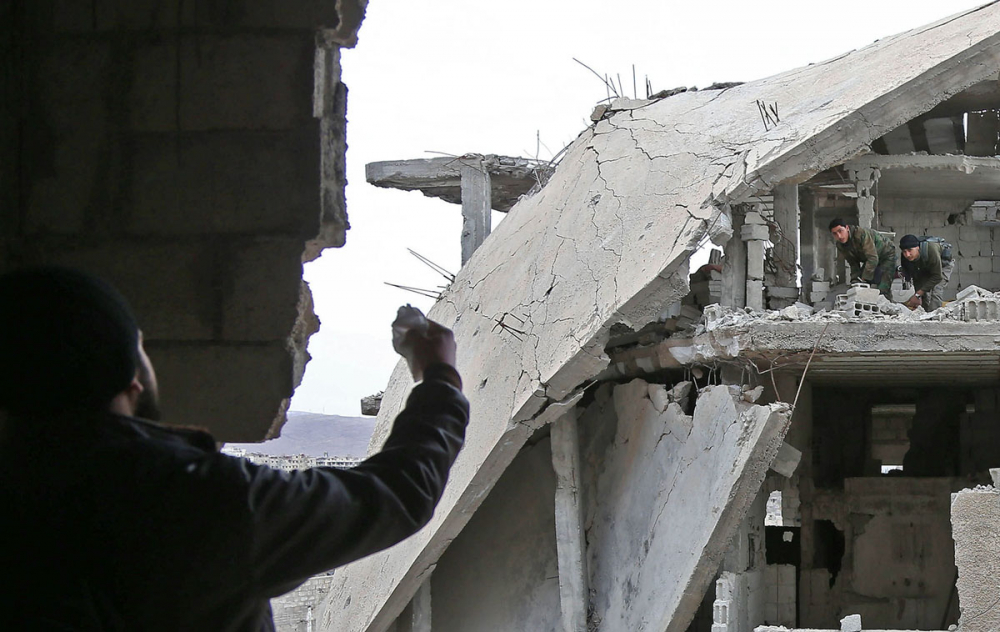 Feylaku'r Rahman tugayından Suriyeli muhalifler, Arbin'deki hasarlı binaların çatılarından birbirleriyle iletişim kuruyorlar.