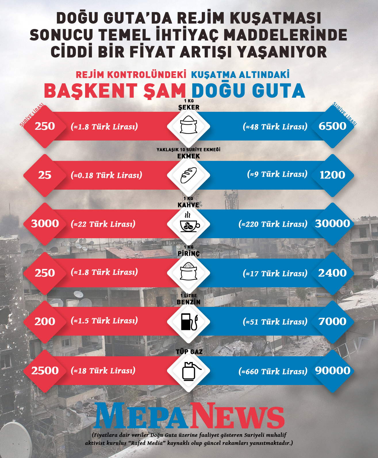 İnfografikte yer alan rakamlar Doğu Guta ile, bölgenin yalnızca birkaç kilometre dışında rejim tarafından kontrol edilen bölgelerdeki fiyatlar arasındaki uçurumu gözler önüne seriyor. Şam merkezi ile Doğu Guta'da temel ihtiyaç maddelerindeki fiyatlar arasında 10 kattan 50 kata kadar büyük bir fark var. Örneğin, rejim kontrolündeki bölgelerde bir kilogram pirincin fiyatı 250 Suriye Lirasıyken, Doğu Guta'da bu fiyat yaklaşık 10 kat fazla, yani 2400 Suriye Lirası. Gıda maddelerindeki bu pahalılık bölgede açlığa ve açlığın neden olduğu hastalıklara bağlı ölümler yaşanmasına sebep oluyor. Suriye İnsan Hakları Ağı'na göre bölgede bugüne kadar bu nedenlerle 206 çocuk ve 67 kadın yaşamını yitirdi.