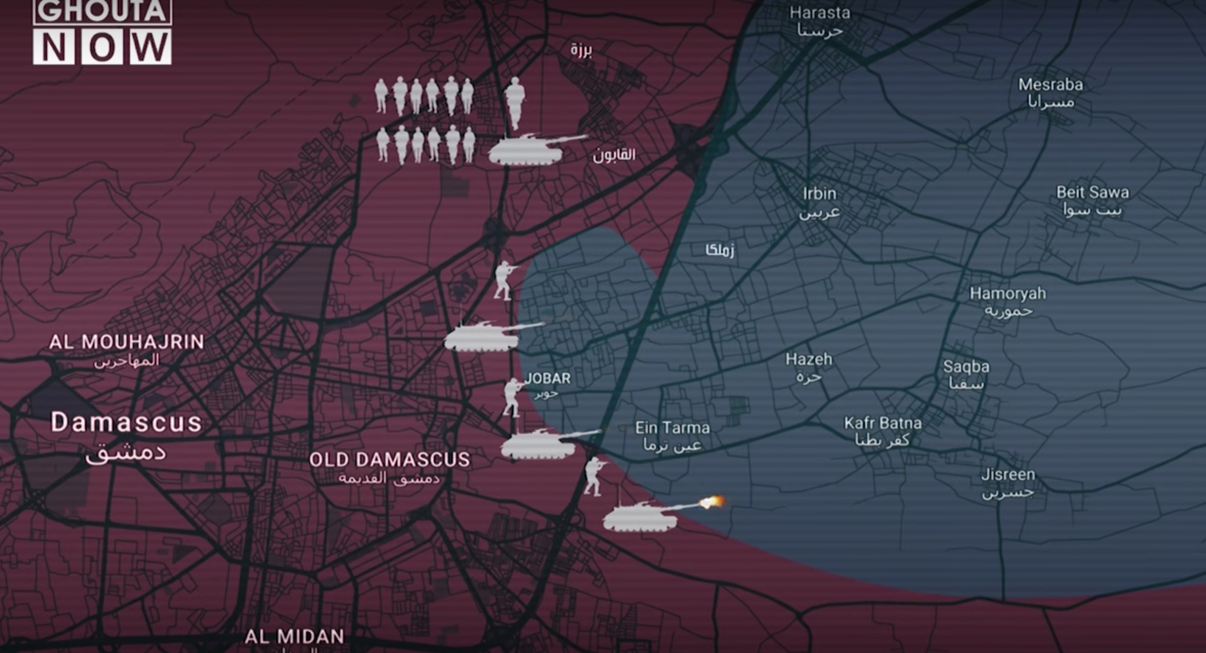 Doğu Guta ve Cobar mahallelerine yönelik rejimin sürekli olarak denediği ilerleme girişimlerinden bahsedilen videoda, muhalifler tarafından ilerleme girişimlerinin bugüne kadar başarısız olduğu vurgulandı.