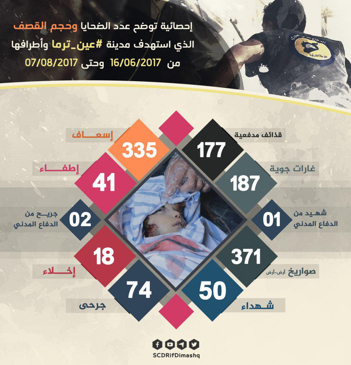 Sivil Savunma birimi tarafından yayınlanan infografikte yer alan rakamlara göre, 16 Temmuz - 8 Ağustos tarifleri arasında rejime bağlı güçlerin Doğu Guta bölgesine düzenlediği hava ve kara saldırılarında 50 sivil yaşamını yitirdi 74 sivil ise yaralandı.
