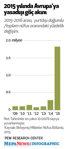 5) Göçmenlerin Avrupa’ya ulaşmak için izlediği rota sayısında da artış var. 2015 yılında yaklaşık 1.8 milyon kişi yasal olmayan yollarla Avrupa Birliği sınırlarını geçti. Bu rakam 2014 yılında 280.000 ve 2013 yılında ise 100.000 civarındaydı. Türkiye’den Yunanistan’a geçmek için – çoğunlukla Suriyeli, Afgan ve Iraklılar tarafından – kullanılan Doğu Akdeniz rotasını kullananların sayısı 2014’de 50.000 iken 2015’de 900.000’e yükseldi. İçlerinde İspanya’ya geçiş için kullanılan ve İtalya’ya geçiş için kullanılan Orta Akdeniz rotaları geçmiş yıllarda da olduğu gibi mülteciler tarafından çoklukla tercih edildi. Avrupa’ya 2015 yılında giren göçmenlerin çoğu aynı yılın sonraki aylarında mülteci statüsü kazanmak için sığınma talebinde bulundu.