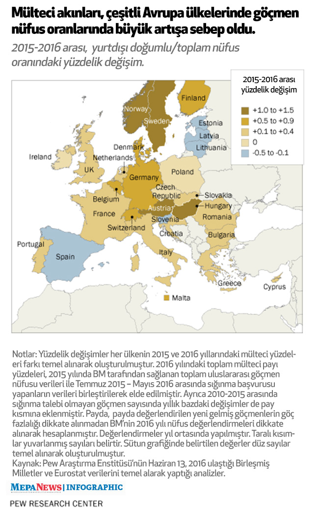 Ülke dışında doğanların nüfus içindeki payı en çok artan ülke İsveç oldu. Bu oran 2015 yılında %16.8 iken 2016 yılında %18.3’e yükseldi. Yine bu süre zarfında Norveç ve Avusturya’da da bu istatistikte %1’lik bir artış görüldü. Çok az sayıda sığınmacı kabul ettikleri için Fransa ve Birleşik Krallık’ ta daha küçük artışlar görüldü. Karşılaştırmak gerekirse Amerikan nüfusu içindeki göçmen payı son 10 yıl (2005-2015) içinde %1'lik bir artışla %13’den %14’e yükseldi.