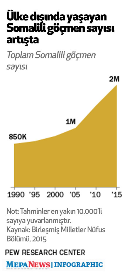 2) Ülke dışına göç eden Somalililerin sayısı yükselişte. Birleşmiş Milletler verilerine göre 1990 ve 2015 arasında Somali’de doğan ancak ülke dışında yaşayan insanların sayısı iki kattan daha fazla artışla (%136) 850 binden 2 milyona yükseldi. Buna karşın Somali nüfusu %71 gibi daha düşük bir artışla 6.3 milyondan 10.8 milyona çıktı. Birçok Somalili komşu ülkelerde ve ABD’de mülteci statüsünde yaşıyor. Ayrıca bazı Somaliler sığınma talebi ile Avrupa’ya seyahat ettiler. Avrupa’ya sığınma talep edenlerin çoğunluğunun mülteci statüsü onaylandı.