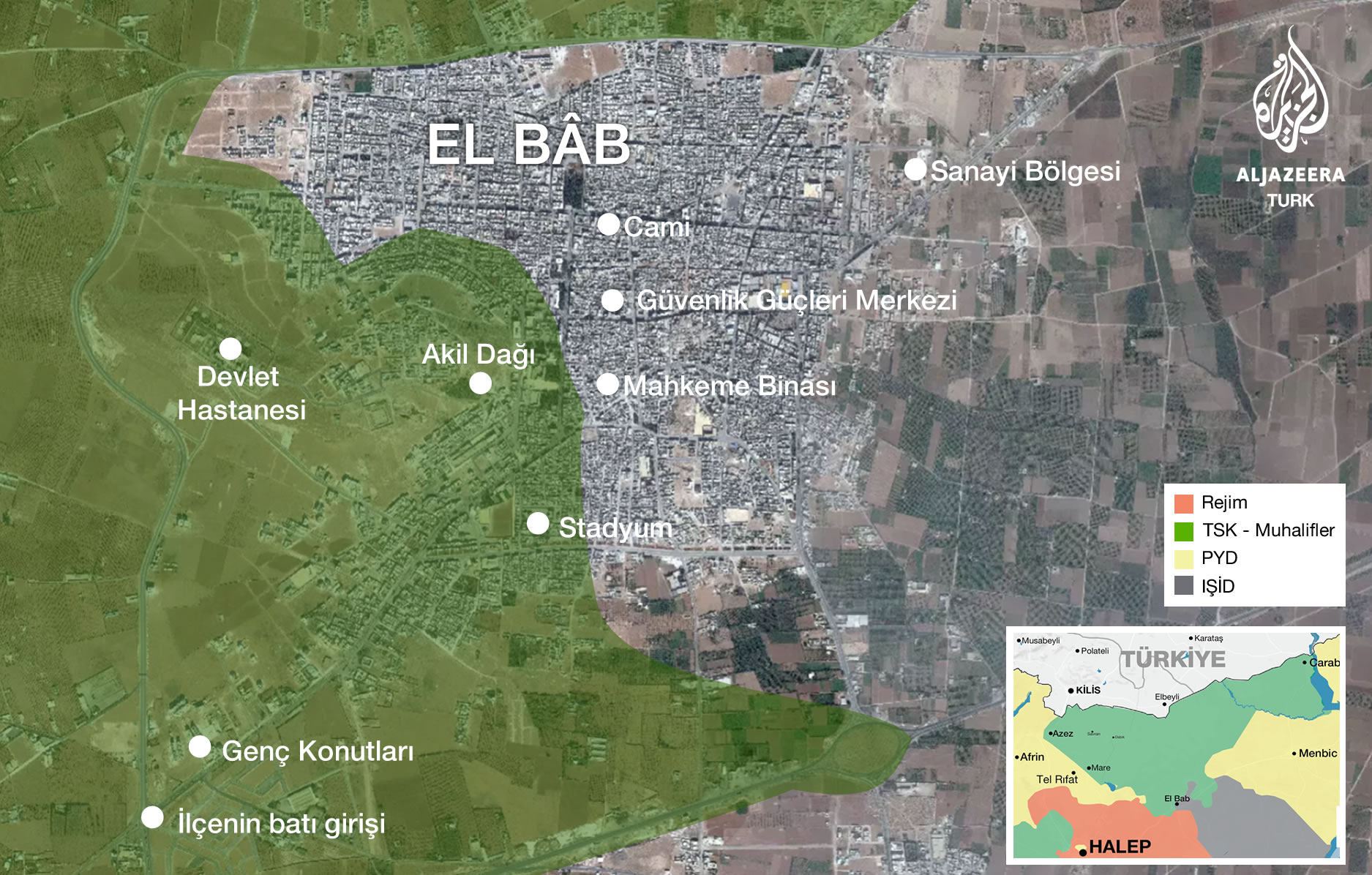Batıdan ve güneybatıdan Bab-Halep yoluna uzanan ÖSO, Anadolu Ajansı'nın yaptığı alan hesaplamasına göre, halihazırda kuzey, batı ve doğudan kuşattığı Bab ilçe merkezinin yaklaşık yüzde 40'ında hakim durumda.