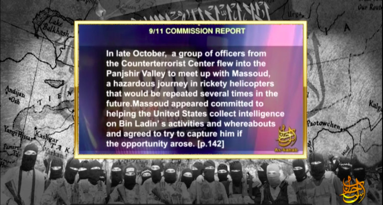 Es-Sahab, Ahmed Şah Mesud'un ABD ile işbirliğini vurgulamak için "11 Eylül Komisyonu Raporu"ndan alıntılara yer veriyor