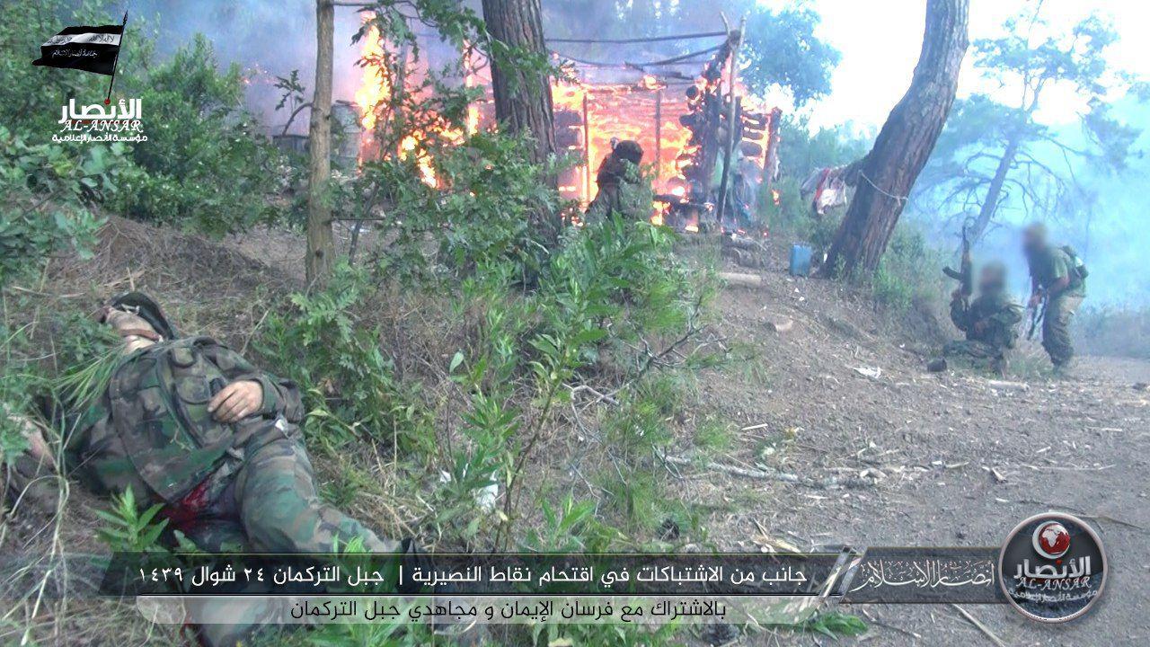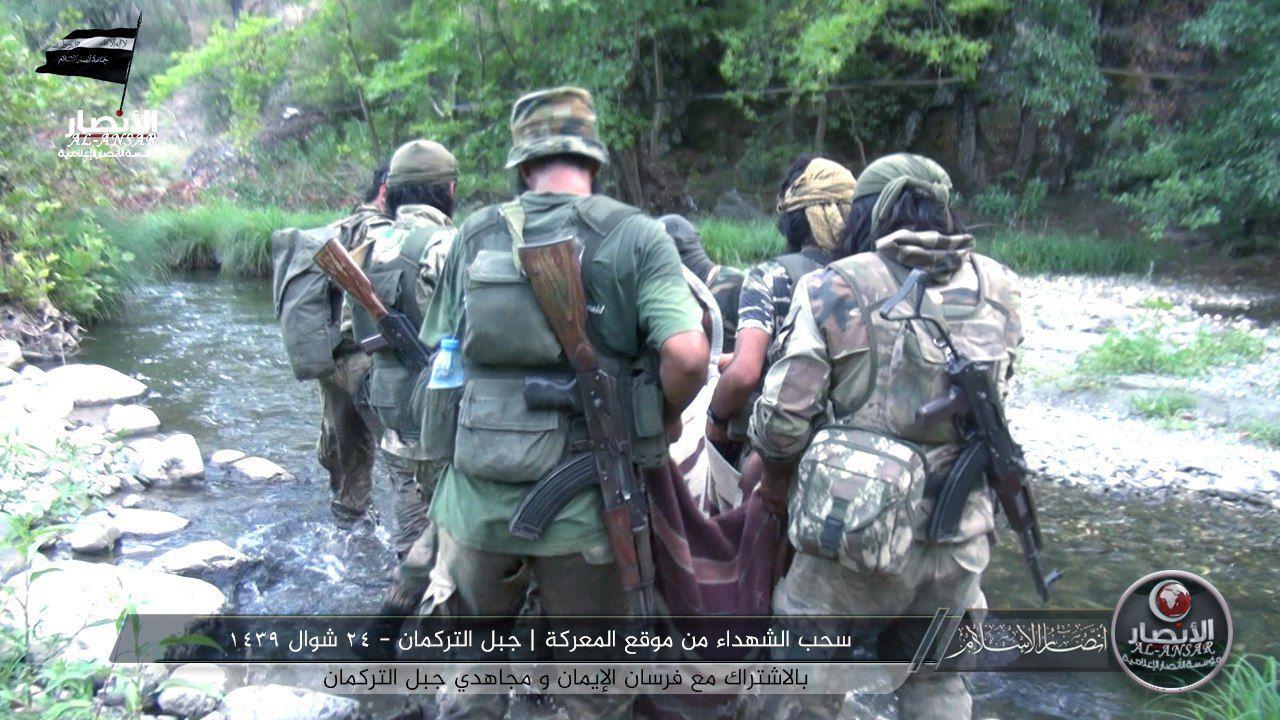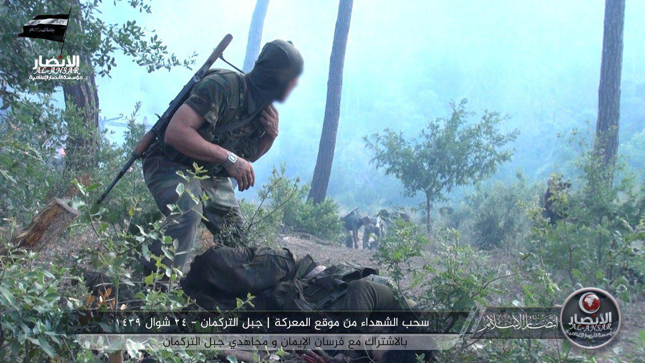 Grubun yayınladığı görüntüler arasında, Türkmen Dağında yaşanan çatışmalarda yaşamını yitiren muhaliflerin cesetlerinin çatışma bölgesinde çıkarıldığı anlar da yer alıyor: