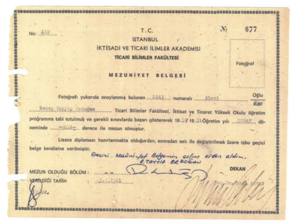 Altun’un açıkladığı belgelere göre, Erdoğan’a bu okuldan verilen 678 no’lu ve 3 Nisan 1981 tarihli geçici mezuniyet belgesi, Dekan Doç. Dr. Sinan Artan imzasını taşıyor. Aynı belgenin 677 sayılı olanında ise Recep Tayyip Erdoğan imzası ve el yazısıyla, "geçici mezuniyet belgemin aslını elden aldım" ifadesinin yer aldığı görülüyor.