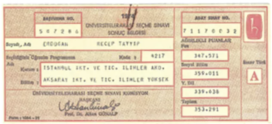 Üniversite sınavına girdiği yıl olan 1974’e ait Üniversitelerarası Seçme Sınavı Sonuç Belgesi’nde ise Erdoğan’ın İstanbul İktisadi ve Ticari İlimler Akademisi’ni kazandığı bilgisi yer alıyor.