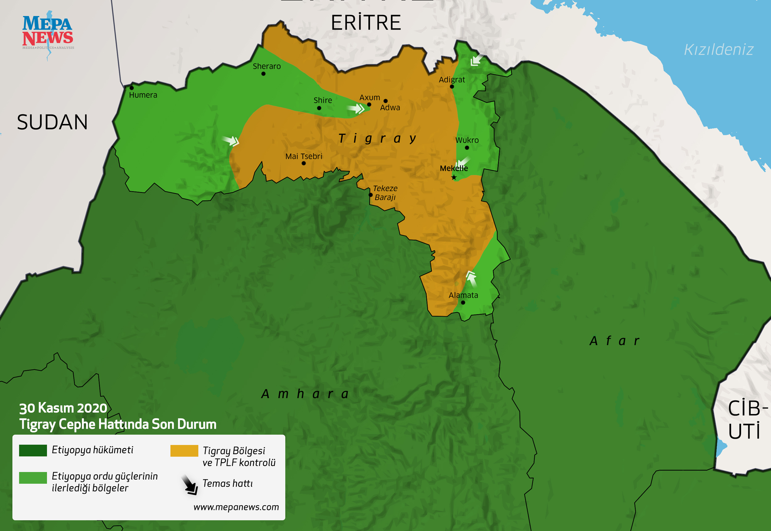 Etiyopya ordu güçleri dün Tigray başkenti Mekelle'ye kuzey ekseninden ilerleyerek, şehri kontrol altına aldı. TPLF şehirden çekilirken, Mekelle çevresinde çatışmaların sürdüğü bildiriliyor.