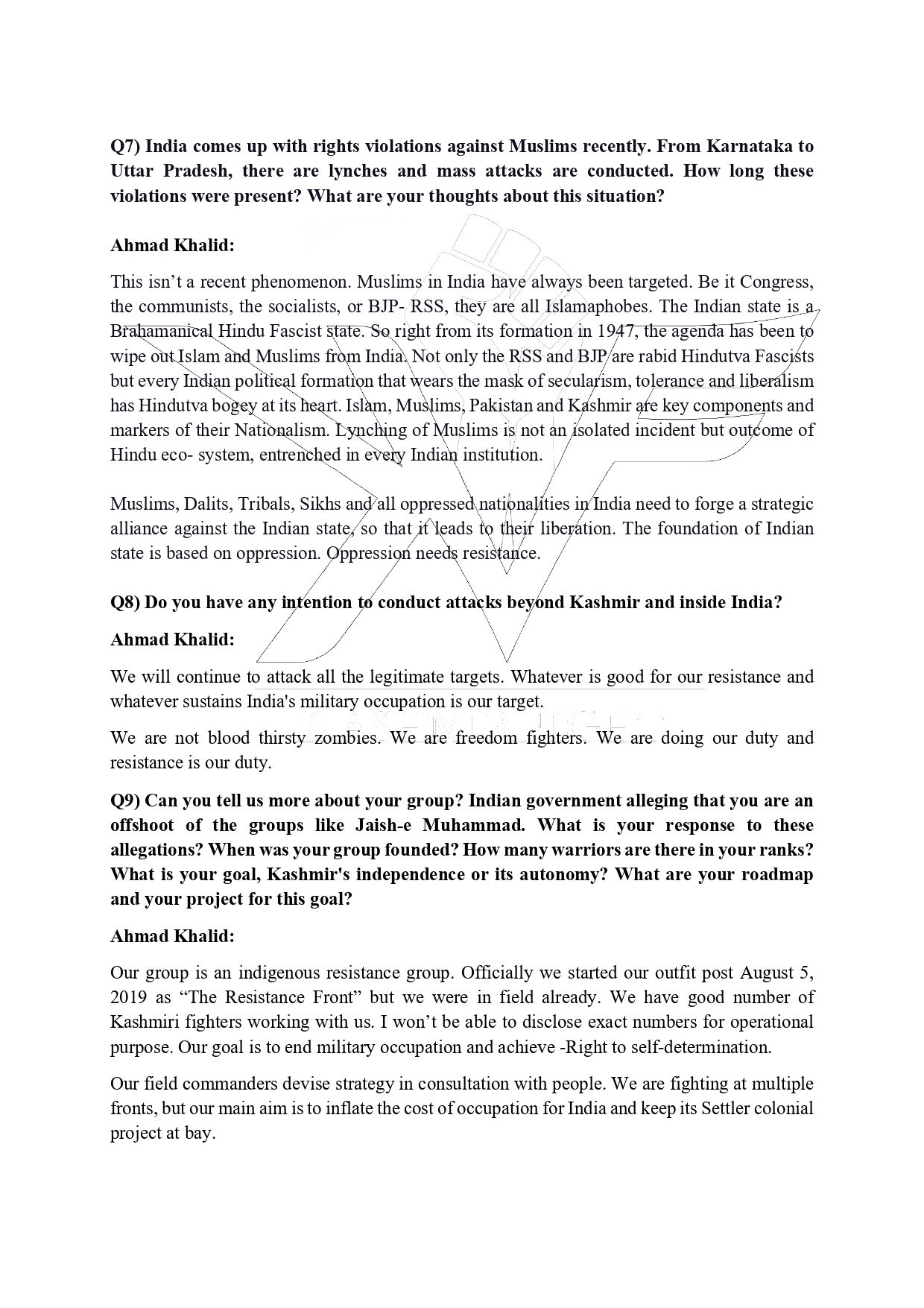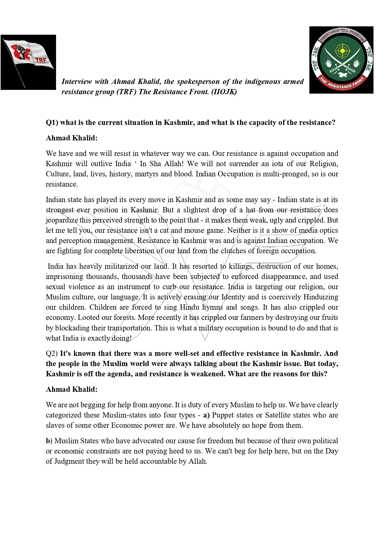 Interview with Ahmad Khalid, the spokesperson of the indigenous armed resistance group (TRF) The Resistance Front. (IIOJK)