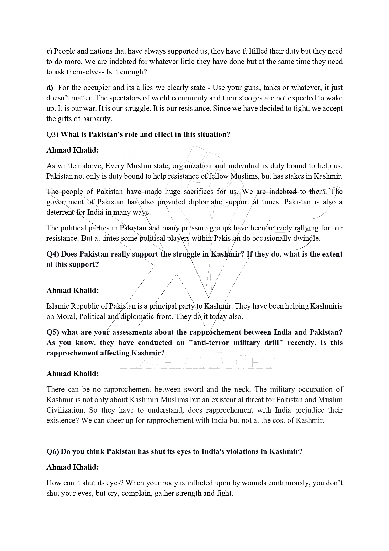Q2) It's known that there was a more well-set and effective resistance in Kashmir. And the people in the Muslim world were always talking about the Kashmir issue. But today, Kashmir is off the agenda, and resistance is weakened. What are the reasons for this?