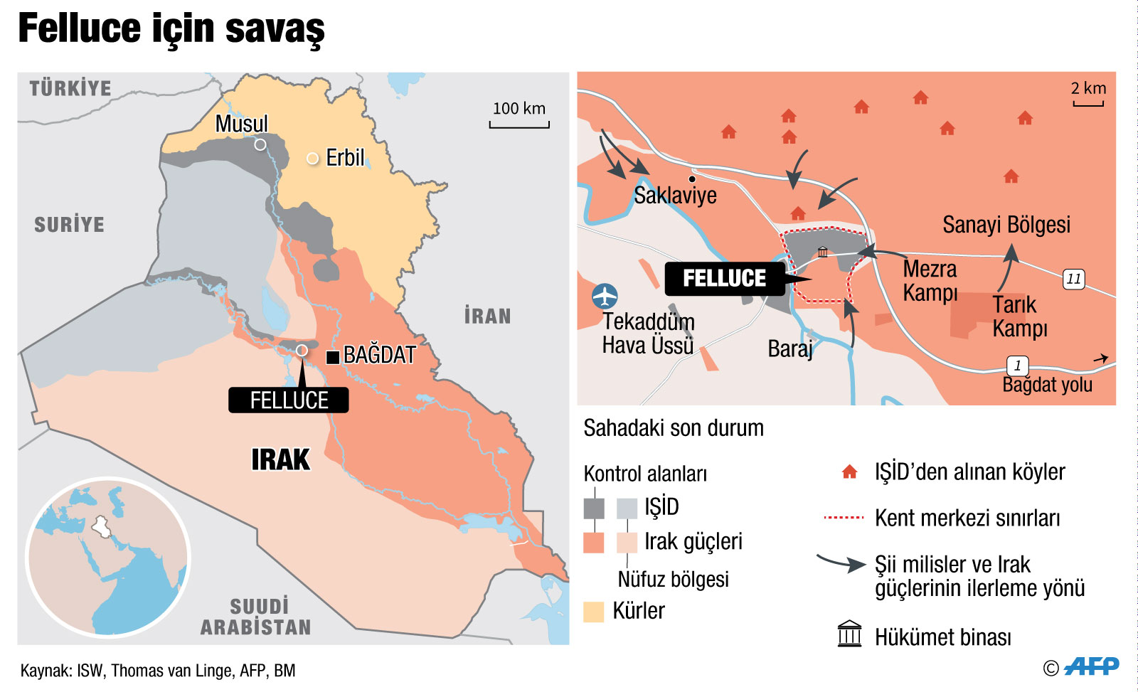 Irak’ın batısında bulunan Anbar eyaleti İl Meclisi, Felluce'de IŞİD'in denetimindeki bölgelerden kaçan 15 bin sivilin emniyet sorgusundan geçirilmesi üzere gözaltında tutulmaya devam ettiğini söyledi. Bağdat yönetimi, IŞİD bölgelerinden kaçan sivillerin bu sorgunun ardından IŞİD ile âlâkası olmadığını kanıtlarsa serbest kalabileceklerini açıkladı. Siviller, Felluce’nin güneyindeki Amiriyet-ül Felluce bölgesinde bir sanayii bölgesi içinde tutuluyor.