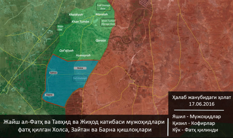CIA'e yakınlığı ile bilinen Long War Journal haber sitesi, Haziran ayının ortasından itibaren Halep bölgesinde üç kilit bölgenin el değiştirdiğini açıkladı. Yapılan analizde, Halsa, Berna ve Zeytan bölgelerini ele geçiren cihat yanlısı grupların, kurdukları ittifak sonucu kısa sürede başarı elde ettiği belirtildi. Haziran ayının başından itibaren Fetih Ordusu kontrol alanını, İran askerlerinin kontrolünde bulunan Han Tuman'a doğru genişletti. Fetih Ordusu Haziran ayının başından itibaren Güney Halep'te geniş kapsamlı bir operasyon başlattı. Han Tuman'ın ele geçirilmesi devamında Halsa, Berna ve Zeytan gibi kasabaların da düşmesine yol açtı.
