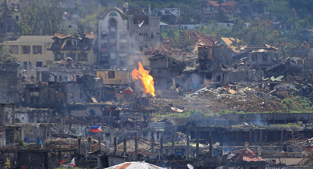 IŞİD kontrolüne geçen şehre yönelik bombardımanda 'yok etme' stratejisi izlendi. Filipinler Devlet Başkanı Rodrigo Duterte, 23 Mayıs'ta Marawi'de 'kalkışma olduğu' gerekçesiyle anayasanın kendisine verdiği yetkiye dayanarak eyalette 60 günlük sıkıyönetim