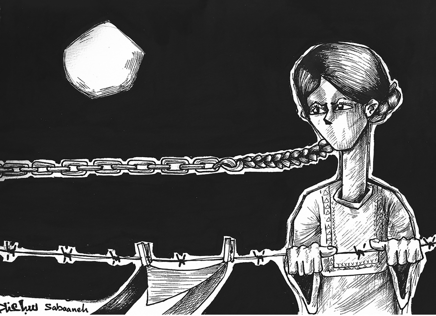 Sabaaneh'in karikatürlerinin birinde Filistinliler hayatlarını küçük alanlarda yaşıyorlar. Herkes içiçe ve mahrem diye birşey yok çünkü İsrail askerleri sizi her dakika izliyor.