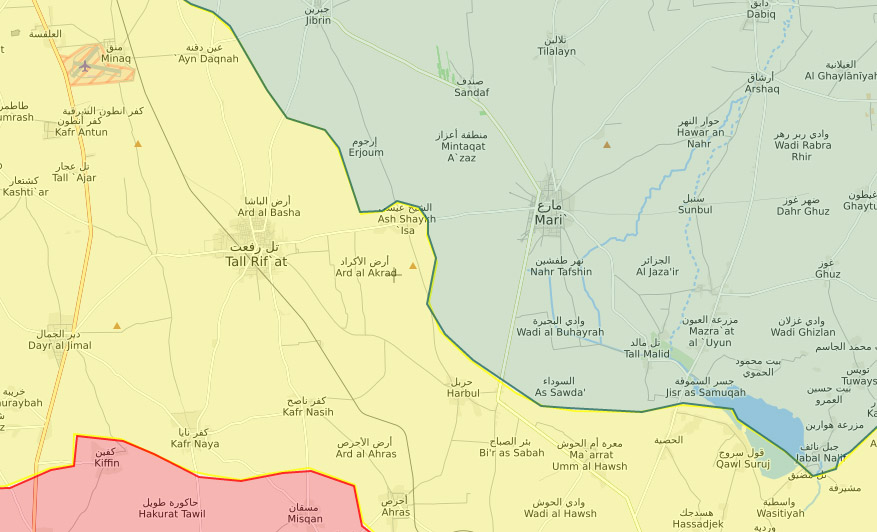 Yeşil: TSK destekli muhalifler, Sarı: PYD/YPG, Kırmızı: Rejim