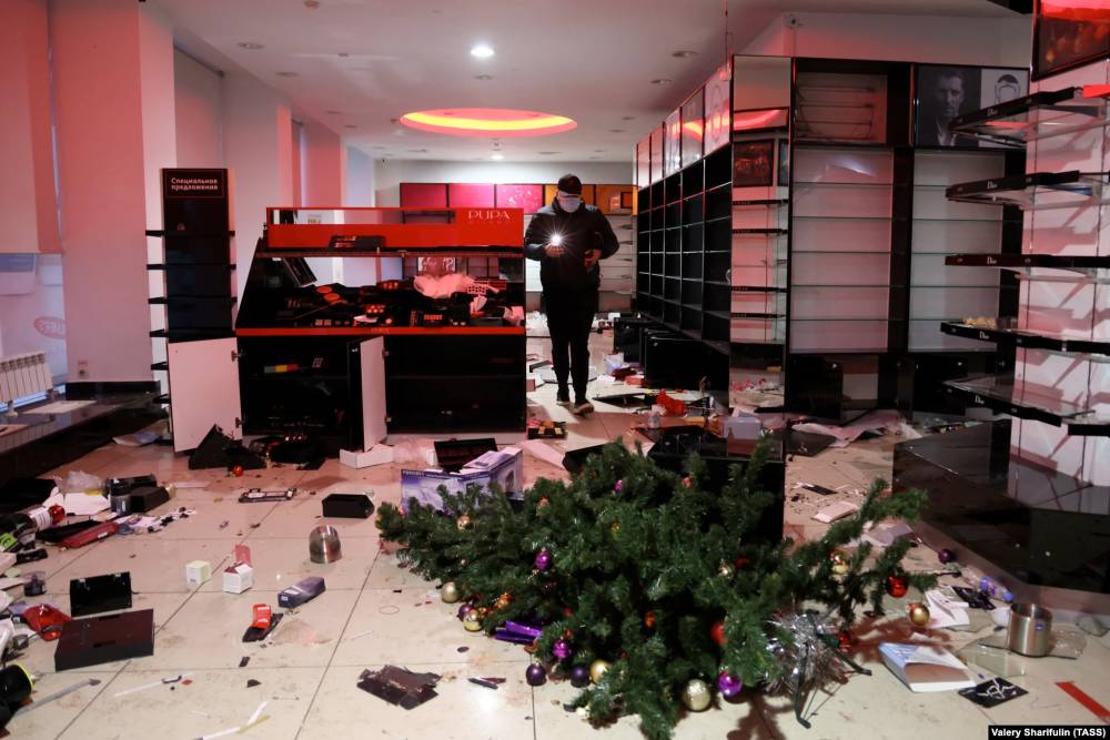 Protestoların şiddetli bir şekilde yaşandığı Almatı'da bir dükkan, 6 Ocak