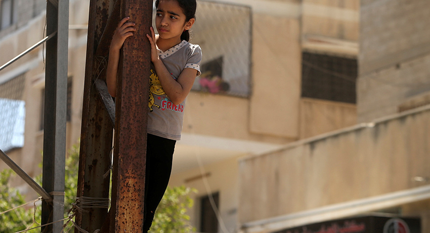 Filistinli bir kız, Gazze'de balıkçı olan Mohammed Baker'ın cenazesini, tırmandığı elektrik direğinden izliyor. 16 Mayıs 2017.