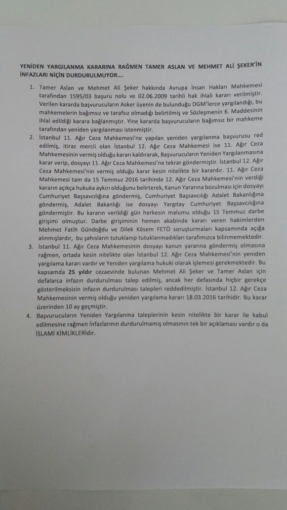 25 yıldır mahkum halde bulunan Mahkum Tamer Aslan ve Mehmet Ali Şeker hakkındaki Avrupa İnsan Hakları Mahkemesi kararlarına rağmen yeniden yargılama gerçekleştirilmedi.
