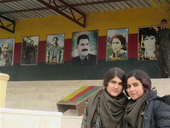 Savaşçıların Abdullah Öcalan posteri önünde poz verdikleri görülüyor.